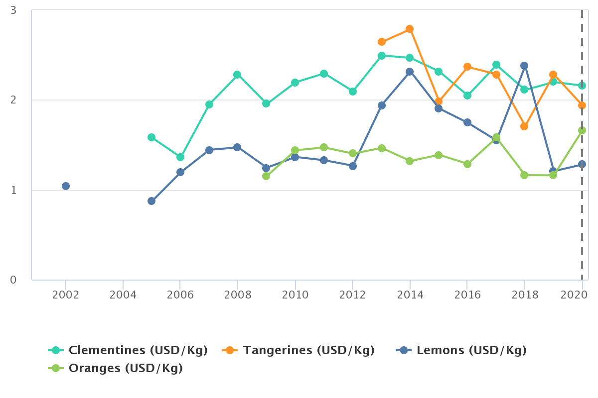 Retrocediendo el reloj 20 años atrás, podemos realizar observaciones con mayores detalles. Las mandarinas han mantenido precios altos desde 2013, cuando se vendió suficiente fruta en los mercados. Incluso a pesar del tremendo crecimiento en los volúmenes que ha experimentado la categoría, los precios se han mantenido más optimistas de lo que se podría haber esperado.