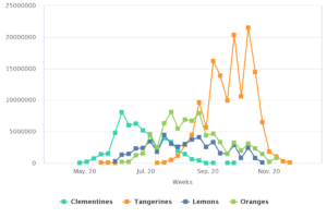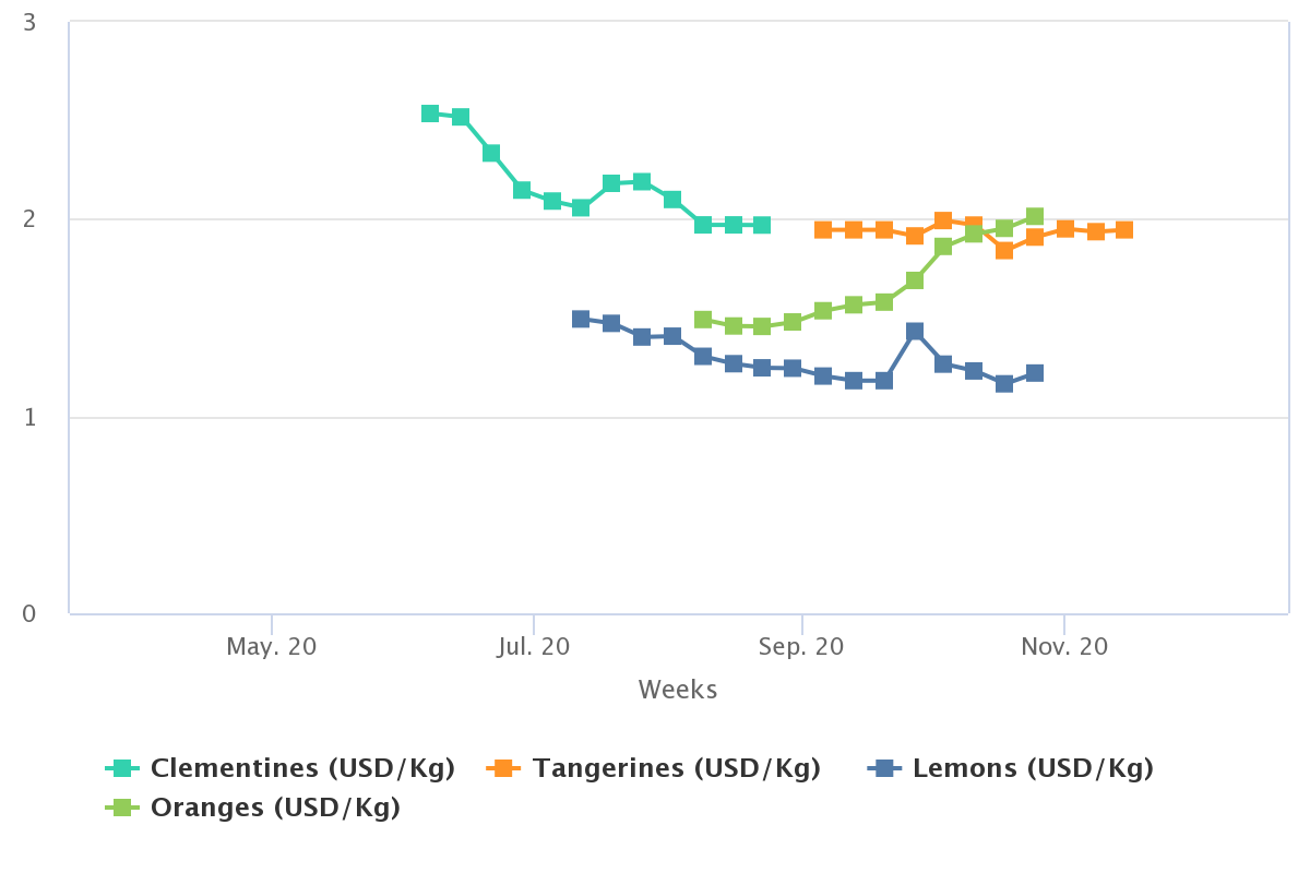 Los precios revelan una idea de por qué los mercados de mandarinas han sido más atractivos que las otras categorías de fines de la temporada. Con un precio sólido durante toda la temporada sumando a un nivel saludable por encima de las naranjas y los limones, no es una sorpresa que las mandarinas hayan sido tan populares como lo han sido. Sin embargo, si miramos los datos de 2020 no ofrecen una imagen suficiente para entender cómo han evolucionado estas categorías.
