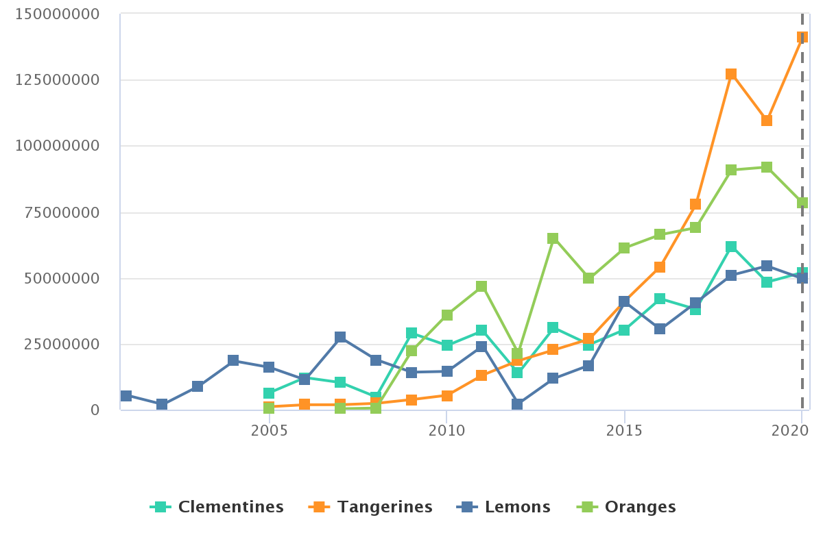 La producción de Chile normalmente comienza en abril-mayo con clementinas, seguidas de limones y naranjas. La USDA las etiqueta como mandarinas (en Chile se las conoce más comúnmente como mandarinas, aunque hay cierta ambigüedad en las definiciones). Dicho todo esto, está claro que las mandarinas son claramente el jugador principal en el mercado. Sin embargo, no siempre fue así.