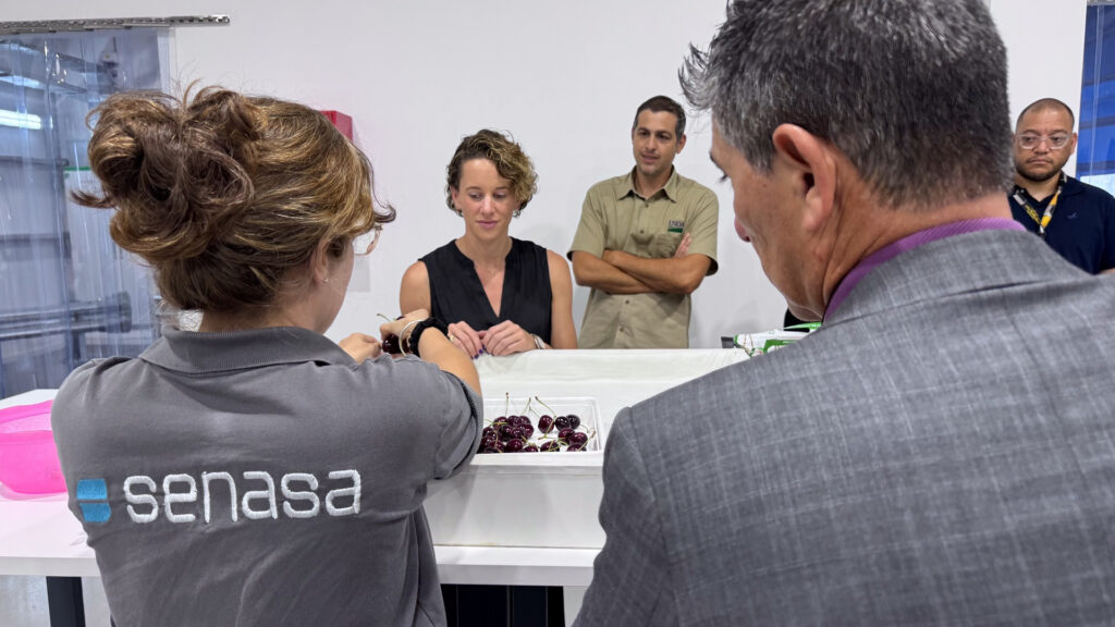 Durante la demostración in situ de la operativa de trabajo de inspección de las frutas con destino a Estados Unidos, el SENASA mostró cómo es el circuito de la carga a inspeccionar, desde que atraca el camión en la sala, la verificación documental y de precintos que se realiza sobre el pallet muestra, y su circulación dentro de la sala. Luego se realizó un ejemplo del procedimiento en la mesa de inspección y la constatación de la ausencia de insectos cuarentenarios para Estados Unidos.