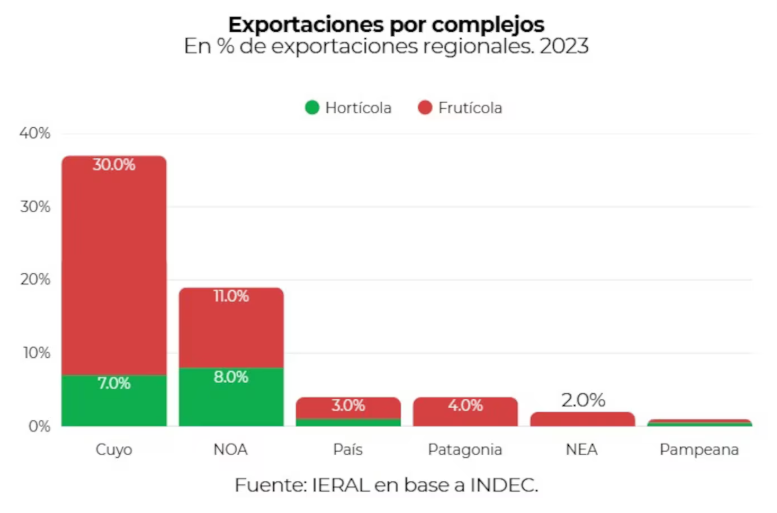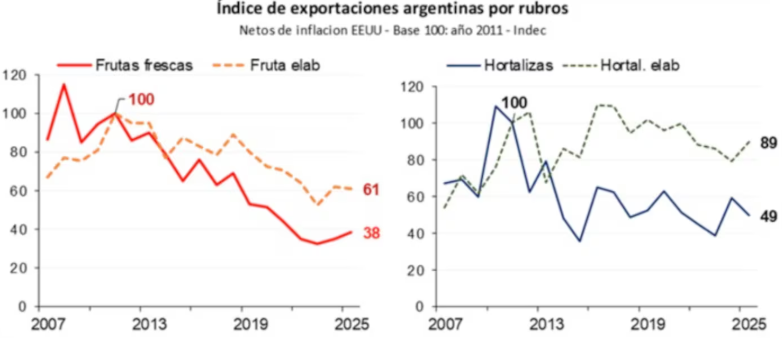 Por ejemplo, en peras cayó de 17,5% en 2013 a cerca de la mitad en 2024, y en vinos del 3,3% en 2012 al 2% en 2024.