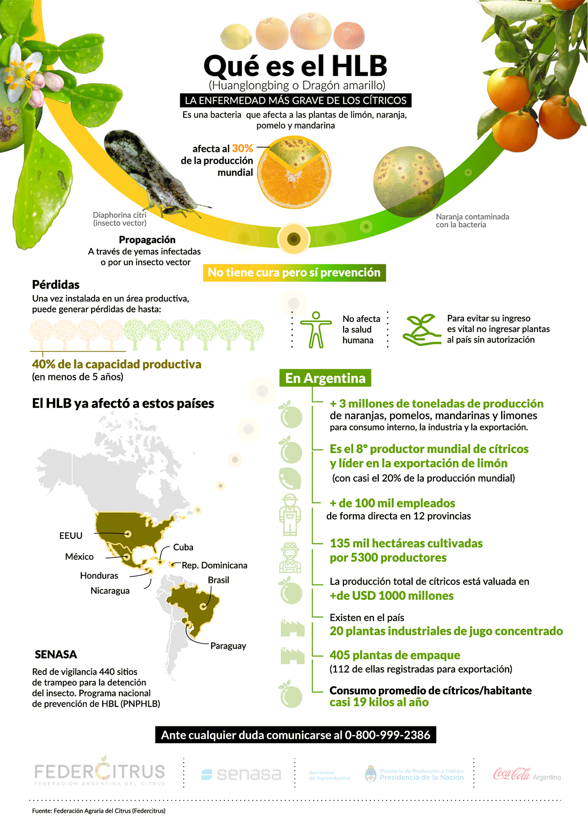En colaboración con la Secretaría de Agroindustria y el SENASA, Federcitrus busca concientizar sobre los efectos del HLB y los riesgos que podría implicar para la Argentina y el impacto real que podría tener en su economía. Asimismo, también se podrían ver afectados los productores, perjudicados por las pérdidas en sus cultivos.
