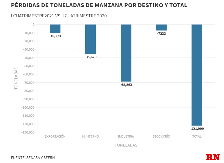 Según detallan los informes realizados por el Senasa, las exportaciones de esta especie alcanzaron las 24.000 toneladas, cifra que refleja un desplome en torno al 30% interanual. El mercado interno también mostró una importante restricción con pérdidas porcentuales similares a las de comercio externo. Pero fue la manzana destinada a la industria de concentrados la que más vio resentida su caída, con bajas de un 41% interanual.