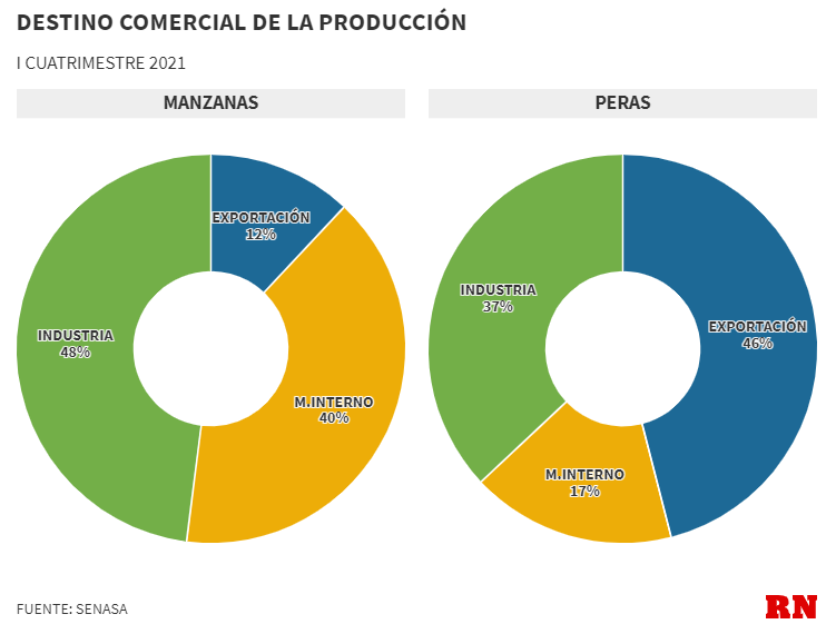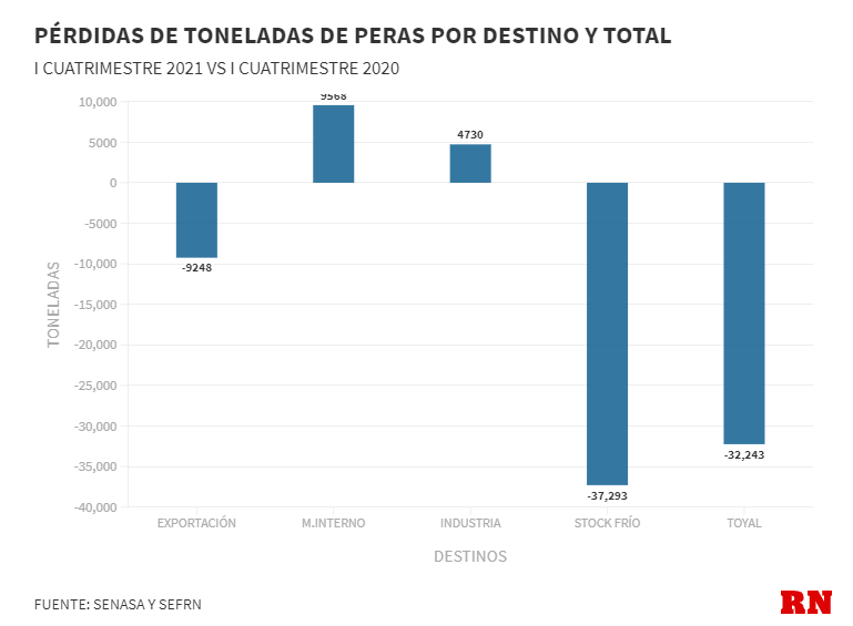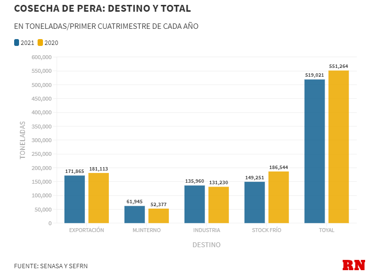 Las estadísticas globales para esta pomácea reflejan que entre lo ya colocado (exportación, mercado interno e industria) en esta primera parte del año y los stocks existentes al 30 de abril en las distintas cámaras, se proyecta un volumen total a comercializar para todo el 2021 de unas 519.000 toneladas. Esta cifra refleja una caída del 6% interanual y, en términos nominales, unas 32.000 toneladas menos de peras disponibles para el mercado.