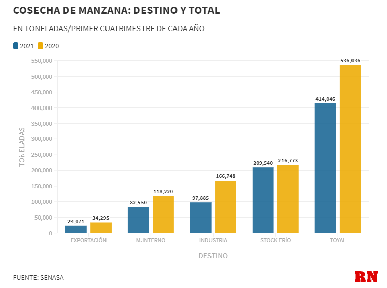 -Las declaraciones juradas informadas por las empresas que almacenan fruta en frío representen el 80% del total de frigoríficos establecidos en Río Negro durante los años 2020 y 2021. Por otra parte, no se tiene en cuenta la estructura de frío que existe en Neuquén, qué si bien es marginal respecto de la existente en la vecina provincia, incide en las estadísticas finales.