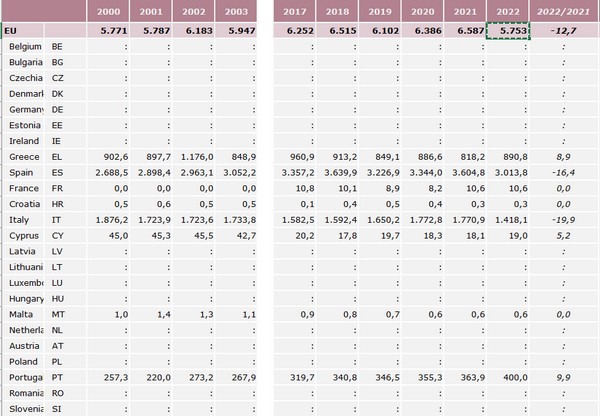 Según los datos anuales de producción de cultivos de Eurostat, entre 2000 y 2022, la superficie dedicada a huertos de naranjos en la UE se ha reducido de 314.400 a 261.900 ha. Italia en particular, ha registrado una caída de 108.700 a 70.400 ha.