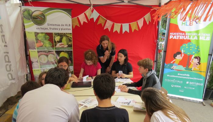 Durante las dos jornadas de la tradicional fiesta de la Naranja de Ombligo, Senasa junto a Inase llevó a cabo actividades didácticas para los niños sobre el reconocimiento de una enfermedad que afecta a los cítricos: el HLB. Bajo el concepto “Patrulla HLB”, los chicos aprendieron el cuidado de lo cítricos con juegos y a través de dibujos para pintar.