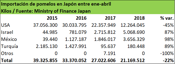 Los pomelos son la segunda especie en volumen, con un total de 21.170 toneladas importadas entre enero y abril, lo que implica un 22% menos que el año pasado y al igual que las naranjas, la tendencia de los últimos años es a la baja.