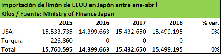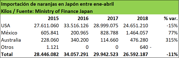 Las importaciones de cítricos en Japón durante el periodo entre enero y abril de este año alcanzaron 77.222 toneladas, lo que implica una disminución de un 10% respecto al total que se alcanzó en el 2017.