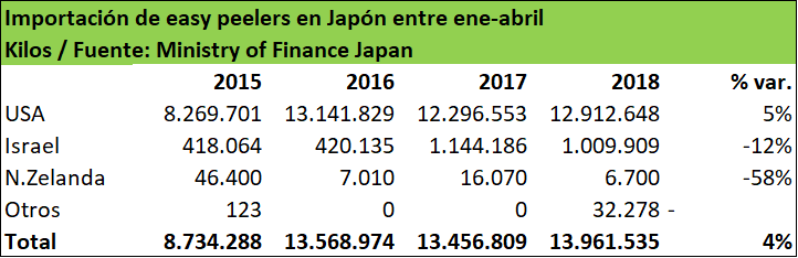 Finalmente, el grupo de las easy peelers, presenta un crecimiento del 4% comparado entre enero y abril del 2017, siendo este el tercer año consecutivo en que los volúmenes se mantienen en torno a las 13.500 toneladas.