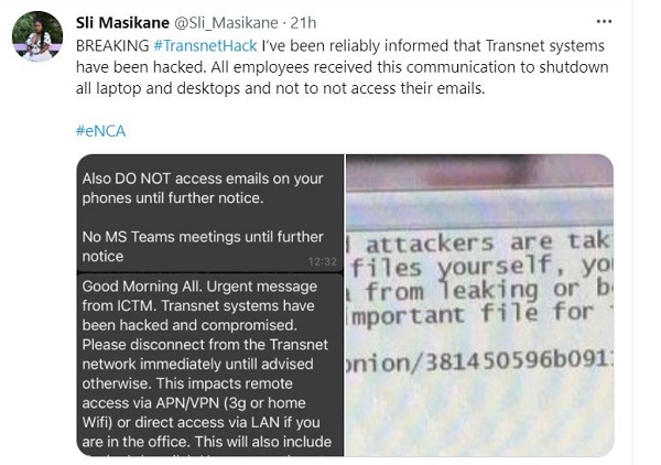 Recientemente, la empresa Transnet ha emitido un comunicado en el que afirma haber identificado y aislado el origen de «la interrupción de sus sistemas informáticos» (la Presidencia sudafricana lo calificó como «ciberataque»).