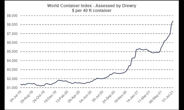 El nivel del Drewry WCI fue un 346% más alto que en la misma semana de 2020, y la media del WCI este año se sitúa en 5.643 $/FEU, en torno a 3.628 $ más que los 2.015 $/FEU de la media quinquenal.