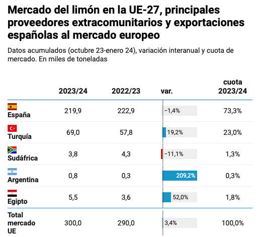 En este año 2024 (enero-marzo) se han importado en la Unión Europea 33.089 toneladas de limones, siendo un 11,8% (–4.400t) menos que lo importado en enero-marzo del año pasado y un +1,8% (+600 t) que la cantidad media de los cinco años anteriores. Los volúmenes se reparten principalmente entre Turquía (86,1%), el cual recorta sus envíos un 3,9% (–1.200t) respecto a la media, y Egipto (13,4%), el cual incrementa sus volúmenes en un 143,2% respecto de la media (+2.600t), lo que supone un avance de 8 puntos en la cuota de mercado.