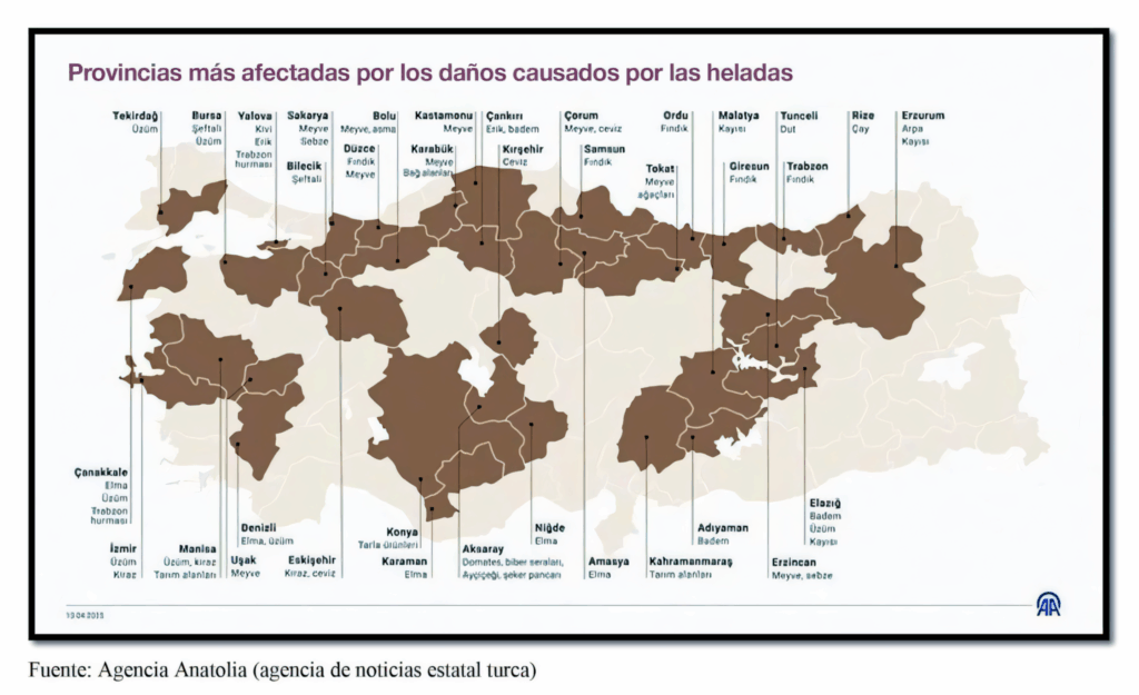 Turquía ha sufrido un episodio de heladas primaverales que ha provocado daños en cultivos de cítricos, frutales y frutos secos en todo el país. El gobierno turco ha respondido ofreciendo compensaciones económicas a los agricultores para intentar paliar sus pérdidas. Desde finales de febrero, el país ha sufrido tres episodios importantes de heladas: