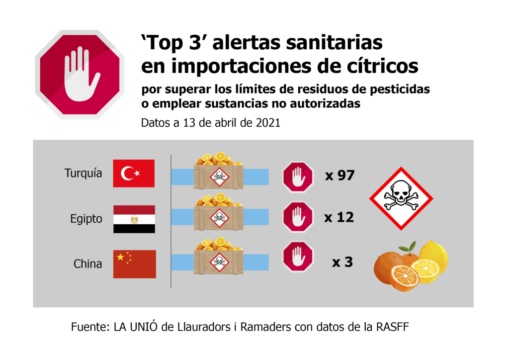 La Unió de Llauradors informa que Turquía y Egipto acaparan, en lo que llevamos de año, prácticamente todas las alertas sanitarias por residuos de pesticidas en importaciones de cítricos que se han detectado en la Unión Europea (UE). Tanto por superar el límite máximo (LMR), como por emplear sustancias no autorizadas en la UE, como el clorpirifos o el metil clorpirifos.
