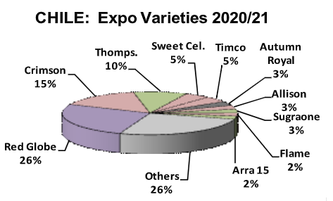 Actualmente la oferta varietal de Chile, Perú y Sudáfrica se ha ampliado enormente, habiendo un sinnúmero de nuevas variedades de los diferentes colores de uvas. Todavía no se sabe cuales de estas van a ser las más exitosas y se van a imponer, aunque ya se vislumbran algunos lineamientos. Por ejemplo dentro de las clásicas la mayor reducción se dio para la Thompson y Flame, mientras que la Crimson sigue siendo una de las más exportadas. Dentro de las patentadas hay algunas que en los 3 países están dentro de los primeros lugares; en caso de las rosadas son la Sweet Celebration y Allison; en las blancas la Sweet Globe y Arra 15.