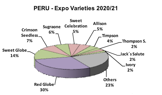Hace 10 años el 75% de su exportación era Red Globe. Se hizo un enorme recambio varietal, de tal forma que hoy solo un tercio es la Red Globe, hay un 20% de otras clásicas (Crimson, Sugraone) y la otra mitad son las patentadas. Dentro de esta se destaca la Sweet Globe, que pasó a ser la segunda variedad exportada por Perú. Además a diferencia de Chile y Sudáfrica, en Perú so, dentro de las nuevas varieades, las blancas las que tiene mayor participación. Junto con Sweet Globe, está la Timpson, Ivory, Arra 15y Sugar Crips.